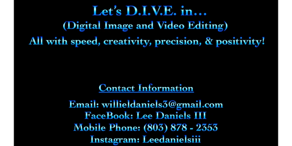D.I.V.E. (Digital Image & Video Editing) Production Company is my first official business; strictly focusing on Photography, Videography, Graphic Design and Editing. This business officially started in April 2023 and has had great success since.